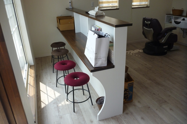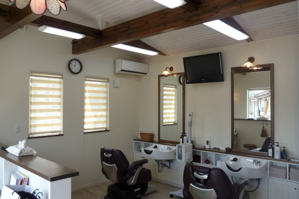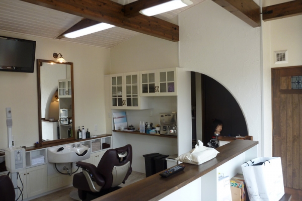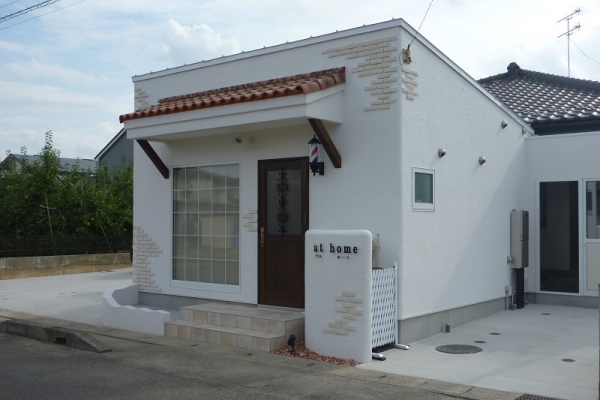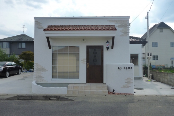 白い塗り壁、レンガ、角をとった丸い外壁にオレンジの瓦!はい、かわいい~この可愛らしい建物はなんとっ理容室なんです!店内の内装もホワイト&ブラウンを基調に、オシャレなカフェのように落ち着く雰囲気に仕上がりました。