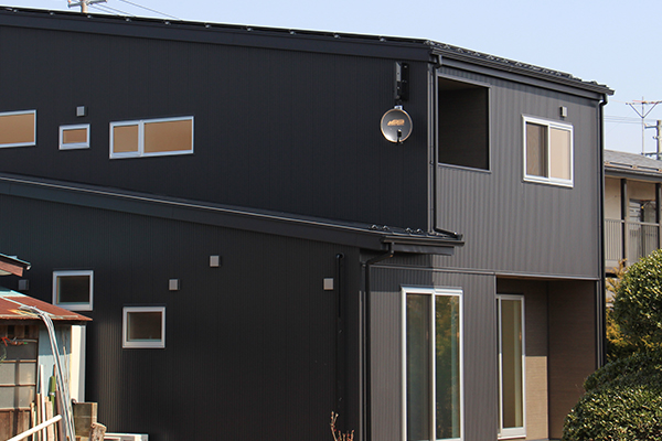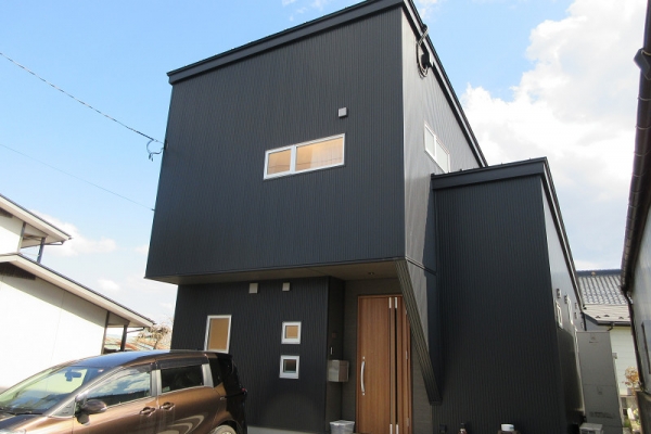施工事例 福島市 D 様 所在地:福島市デザインコンセプト:スタイリッシュモダン ガルバリバウム鋼板を外壁に使ったブラックスタイル!シックな雰囲気にブラウンの玄関ドアが映えます。スタイリッシュな外観には金属製の外壁がとてもよく合いますね。