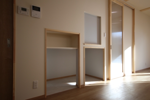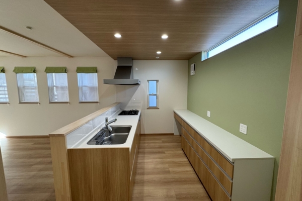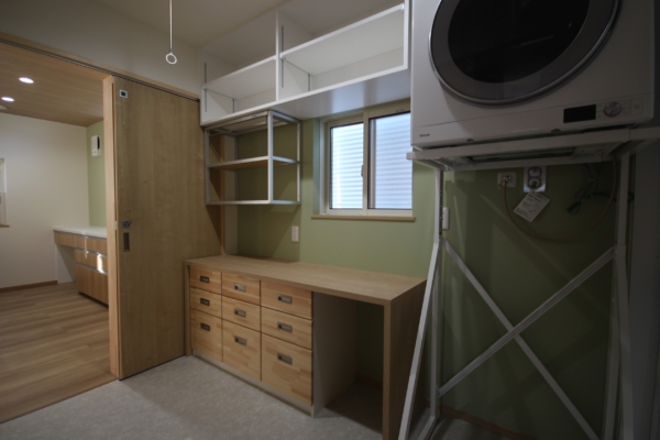 また、キッチン脇に設けられたランドリー室は、ガス乾燥機が備わっており、その場で洗濯物を洗う・干す・畳んで収納がまとめて作業できる空間になっています。