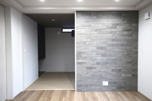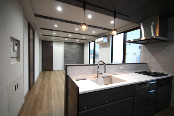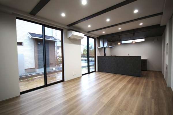 天井や梁など黒系のアクセントパーツを採用したLDK、