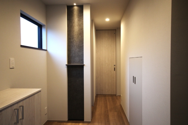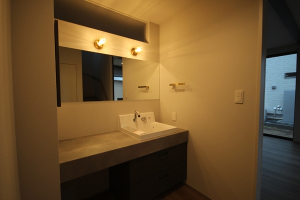 ランドリーに設けた引出しにもレザー調の面材を採用。